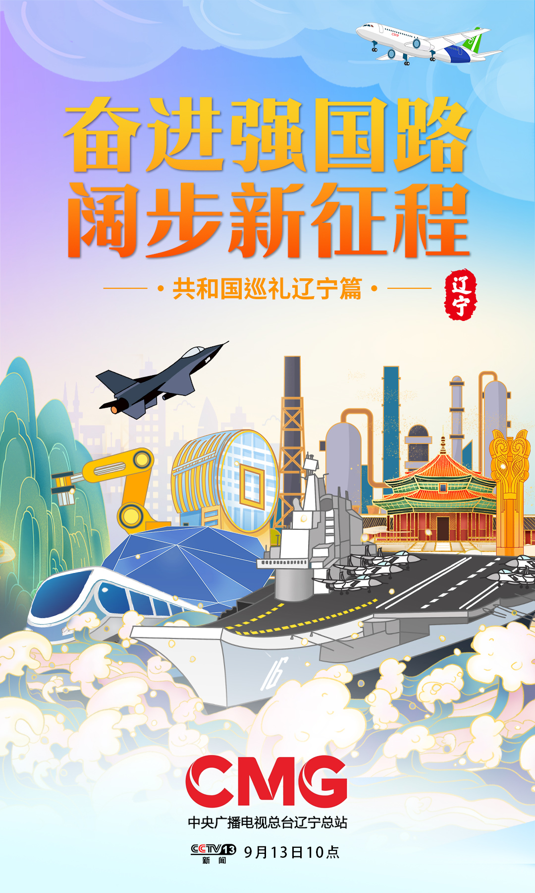 庆祝中华人民共和国成立75周年特别节目《共和国巡礼》,9月13日,走进辽宁。辽宁位于东北三省最南端,这里不仅拥有肥沃的黑土地和绵延的海岸线,还有实力雄厚的工业基础和勇于担当的奋斗故事。这是一片挺起共和国工业脊梁的土地,上千个新中国的“第一”都诞生于此,镌刻着辽宁人精益求精的工匠精神和忠诚奉献的爱国情怀。党的十八大以来,习近平总书记先后三次到辽宁考察调研,为辽宁全面振兴擘画蓝图。沿着总书记指引的方向,辽宁启动了全面振兴新突破三年行动,高质量发展迈上新台阶,奋力谱写中国式现代化辽宁篇章。